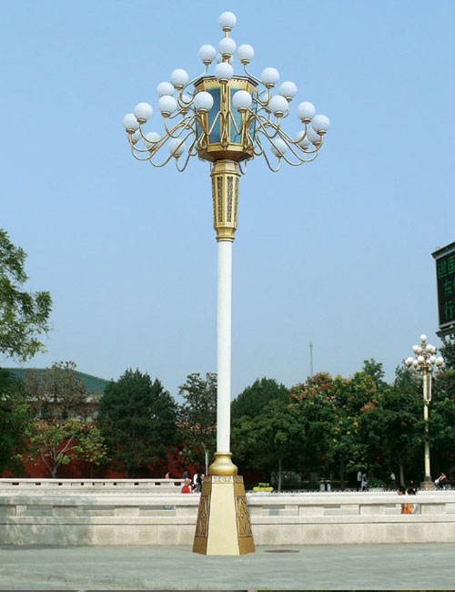 整体高大魁梧,顶端弯臂花枝招展,表漆多为金黄色,尽显中国传统文明的皇家贵族风范。整体外观给人的感觉首屈一指,但是站在专业的照明角度来评价中华灯的话,其实它有很多美中不足的地方,大有华而不实之感。整体来说玉兰灯在外很相似,顶端都是以亚克力灯球为主,来烘托整体的协调和美观,不同的是,玉兰灯灯球里的光源所起到的作用并非照明,而是点缀。